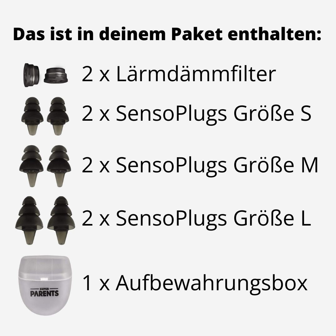 - Ein Paar Geräuschfilter zum Einsetzen in deine SensoPlugs.
