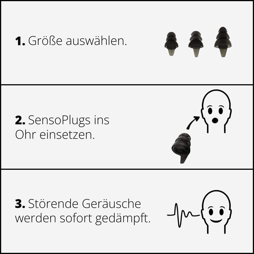 Wenn du SensoPlugs in die Ohren setzt, bist du also vor diesen nervigen Geräuschen geschützt.